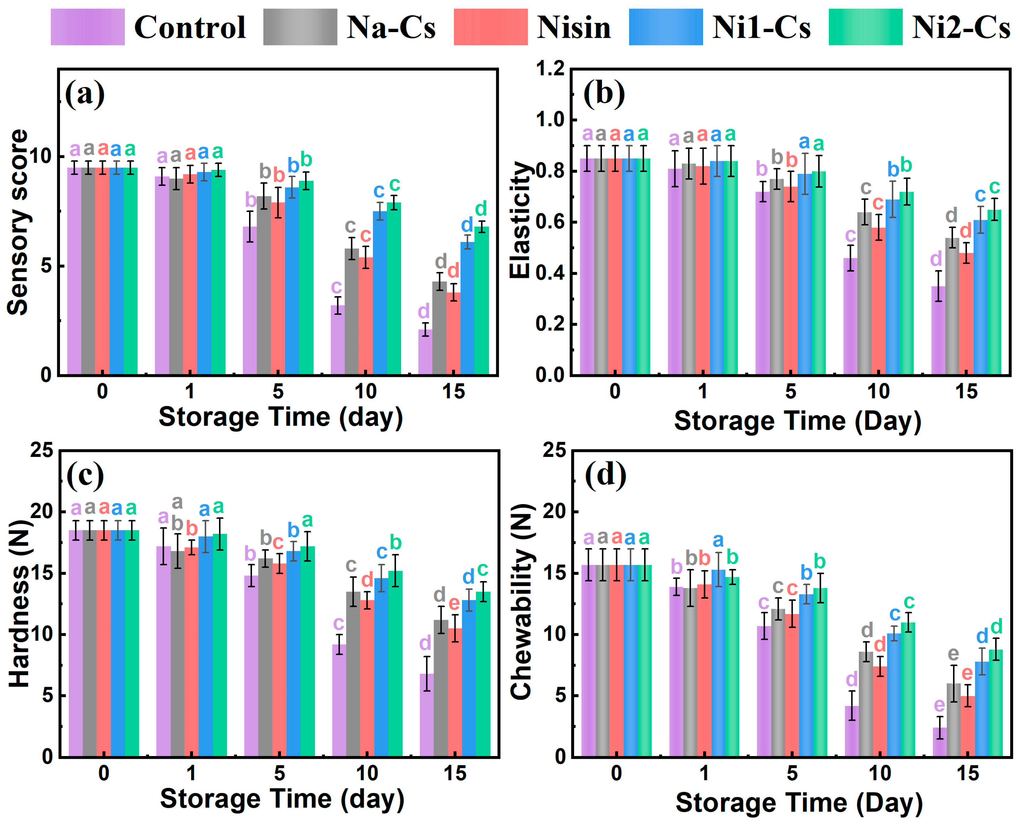 The sea bass preservation trials validated the practical application potential by demonstrating comprehensive protection through multiple synergistic mechanisms. At day 15 of refrigerated storage, Ni2-Cs coatings maintained all critical quality indicators within acceptable ranges: total viable count at 5 log CFU/mL (below the 6 log CFU/mL safety limit), TVB-N at 30 mg/100 g (at the freshness threshold), springiness above 0.6, hardness at 13 N, and TBARS at 2.2 mg MDA/kg. In contrast, control samples had completely deteriorated by day 10, with TVC exceeding 7 log CFU/mL and TVB-N surpassing 55 mg/100 g.
