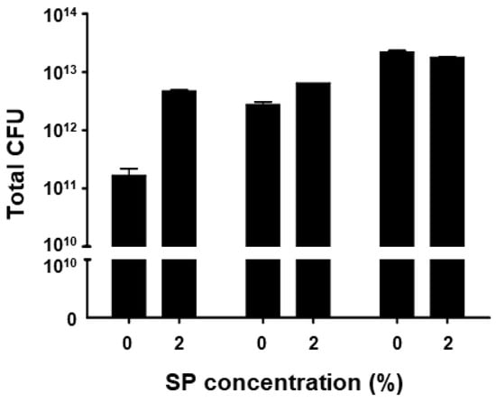 Measured CFU of 3 batches of BST.L-601 culture with 0 and 2% of sweet potato (SP) concentrations. Values are the means ± SD.