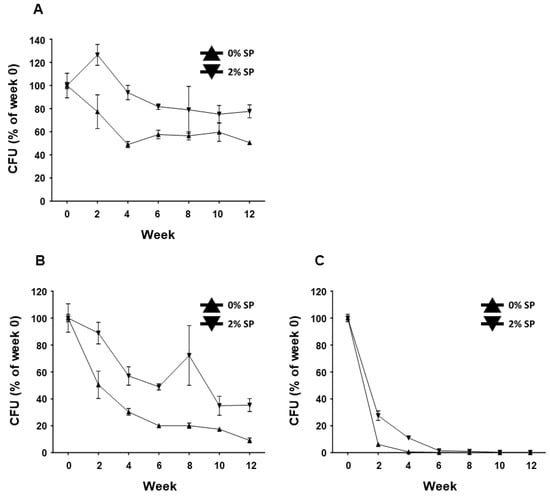 BST.L-601 fermented with 0 and 2% SP powder was collected from the broth, mixed with cryoprotectant, freeze-dried, and pulverized into powder. The powdered BST.L-601 was aliquoted into 1 g portions and stored in silver foil pouches in 3 different conditions (4, 25, and 35 °C). The CFU of stored samples in each condition was measured every 2 weeks. Each sample was subjected to serial dilution with phosphate-buffered saline with Tween 80 (PBST, pH 7.0, 0.1% (w/v) Tween 80), spread onto an MRS agar plate, and incubated for 48 h under anaerobic conditions. The CFU of live bacteria from each sample was measured, and the stability of BST.L-601 was assessed (Figure 2). BST.L-601 fermented with 2% SP powder showed higher CFU than BST.L-601 fermented with 0% SP powder in all three temperature conditions. Samples of BST.L-601 with 2% SP maintained a stable CFU (>50%) for 12 weeks at a low temperature (4 °C) (Figure 2A) and a CFU > 60% for 4 weeks at room temperature (25 °C) (Figure 2B). In extreme conditions (35 °C), BST.L-601 with 2% SP showed a CFU decreased to less than 20% from the second week of storage (Figure 2C).