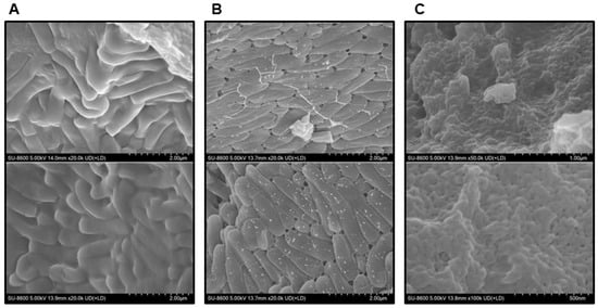 Subsequently, scanning electron microscopy (SEM) (SU8600, HITACHI, Tokyo, Japan) was conducted to infer the effect of the presence or absence of SP powder on the stability of BST.L-601 (Figure 3). Fermented BST.L-601 with identical media composition containing 0 or 2% SP powder and media with 2% SP powder were observed. As shown in Figure 4B, small particle-like substances on the surface of the cells were observed (Figure 3B), in contrast to those without SP powder (Figure 3A).