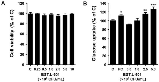 Cell viability, glucose uptake of BST.L-601 in C2C12 myotube. (A) Cell viability, (B) Glucose uptake. The data are expressed as the percentage normalized to the untreated control cells (100%). C, untreated; PC, positive control (insulin); Values are the means ± SD (n = 3), determined by one-way ANOVA and Dunnett’s multiple comparison test (* p < 0.05, ** p < 0.01, *** p < 0.001).