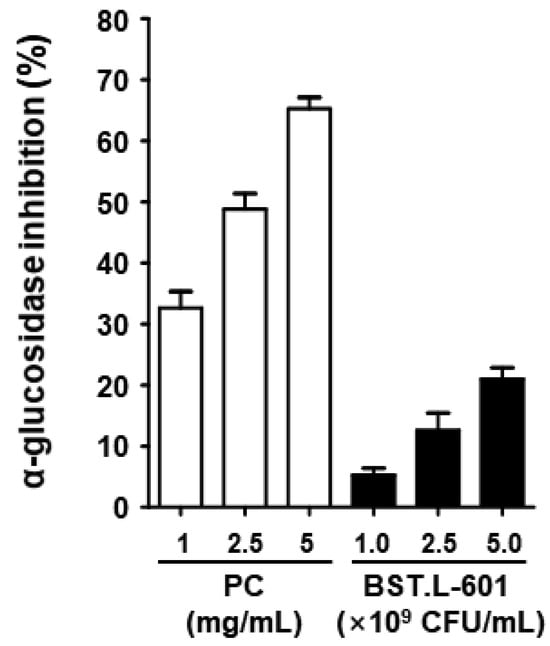 α-Glucosidase inhibitory activities of BST.L-601. The acarbose was used as a positive control (PC). Values are the means ± SD (n = 3).