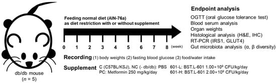 Male C57BL/KSJ mice were prepared as a control group, C, and C57BL/KSJ db/db (Leprdb/Leprdb) mice were divided into 4 experimental groups (n = 5): NC, untreated control; PC, positive control (metformin 250 mg/kg/day); 601-L, freeze-dried BST.L-601 broth at low concentrations (1.00 × 109 CFU/kg/day); 601-H, freeze-dried BST.L-601 broth at high concentrations (2.00 × 109 CFU/kg/day) (Figure 6). Oral administration was prepared with each sample dissolved in PBS and performed daily. Body weight and water intake changes were recorded once a week, with free access to water. Fasting blood glucose (FBG) changes were recorded biweekly, after a 16 h of fast.