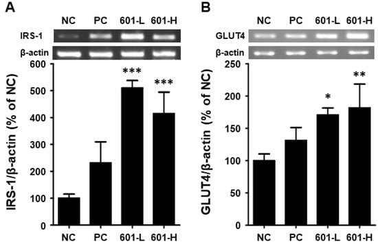 Enhanced metabolism was also demonstrated at the mRNA expression level. RT-PCR using mouse skeletal muscle displayed the intensified expression of glucose-metabolism-related factors, insulin receptor substrate-1 (IRS-1) and glucose transporter 4 (GLUT4) (Figure 7). In T2DM, insulin resistance prevents proper functioning [40]. This leads to dysfunction of the GLUT4 protein, which regulates blood sugar levels by transporting glucose into muscle and fat cells under the direction of insulin [45]. However, in patients with T2DM, insulin signals fail to properly induce GLUT4 transport across the cell membrane, preventing blood sugar from entering the cells [46]. This reduces glucose uptake by muscle and fat cells, leading to excessive accumulation of glucose in the blood, resulting in persistent hyperglycemia [46]. IRS-1 is a key protein in the insulin signaling pathway, regulating glucose uptake through activation of the insulin receptor [47]. When insulin binds to the insulin receptor, IRS-1 becomes phosphorylated and interacts with it. Phosphorylated IRS-1 activates the PI3K pathway, promoting the transportation and activation of the intracellular glucose transporter GLUT4, thereby facilitating glucose uptake into cells [45]. However, in T2DM patients, the phosphorylation (tyrosine phosphorylation) of IRS-1 is impaired, resulting in defective insulin signaling [48]. Abnormal phosphorylation of IRS-1 interferes with PI3K pathway activation, ultimately impairing glucose uptake and increasing blood sugar levels [40].