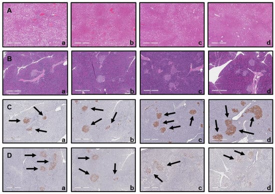 Based on a comparison of organ weight between mice groups and histological analyses of the liver and the pancreas, the cause of improved diabetes biomarkers was hypothesized (Table 3, Figure 8). After sacrificing the mice, organ weight measurements, hematoxylin and eosin (H&E) staining, and immunohistochemistry (IHC) were performed. The spleen and the pancreas exhibited distinct differences in weight between groups (Table 3). Pancreas weight was highest in the untreated group (NC), followed by mice treated with metformin (PC) and BST.L-601 (601-L, 601-H), in which the weight declined. In particular, pancreases of the 601-L group weighed less than those of the PC group, while spleen weights were similar. Consistent with the established correlation between murine inflammation and splenomegaly, the increased weight of the spleen and the pancreas of the NC group was proposed to result from the inflammatory response caused by induced diabetes in the mouse model [49,50]. It is also suggested that lower organ weight implies an improvement in diabetes with a subsequent anti-inflammatory effect through treatment with metformin (PC), a pharmaceutical agent for diabetes, or BST.L-601 interventions (601-L, 601-H). This improvement was further supported by the histological analysis of mice tissues (Figure 8). In a mouse model induced with type 2 diabetes, it was confirmed that β cells in the pancreatic islets of mice group fed BST.L-601 (601-L, 601-H) regenerated and recovered their function, resulting in increased insulin secretion, and glucagon secretion was reduced in α cells that increase blood sugar levels.