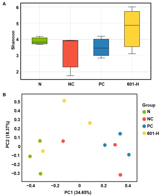 A decrease in microbial diversity can lead to an imbalance in the gut environment, increasing intestinal inflammation and insulin resistance and increasing the risk of developing diabetes [51]. Therefore, increasing gut microbiota diversity can have a positive impact on diabetes prevention and management [51,52]. Consuming specific microbes or fermented foods containing them, as well as fecal microbiota transplantation (FMT), can have anti-diabetic effects [53]. In the present study, the mouse gut microbial diversity of the BST.L-601-treated group was evaluated using alpha diversity analysis (Figure 9A), which evaluates diversity within a sample, and beta diversity analysis (Figure 9B), which measures diversity between samples. The α diversity analysis (Figure 9A) displayed that BST.L-601 administered mice group (601-H) has a wider range of intestinal microbial flora than the N (normal group), NC (diabetes induced group), and PC (metformin treated group). This result suggested that the consumption of BST.L-601 induced proliferation of probiotic microorganisms. Additionally, the β diversity analysis (Figure 9B) showed that the bacterial community diversity in the 601-H group differed from NC and PC, non-consuming probiotics groups.