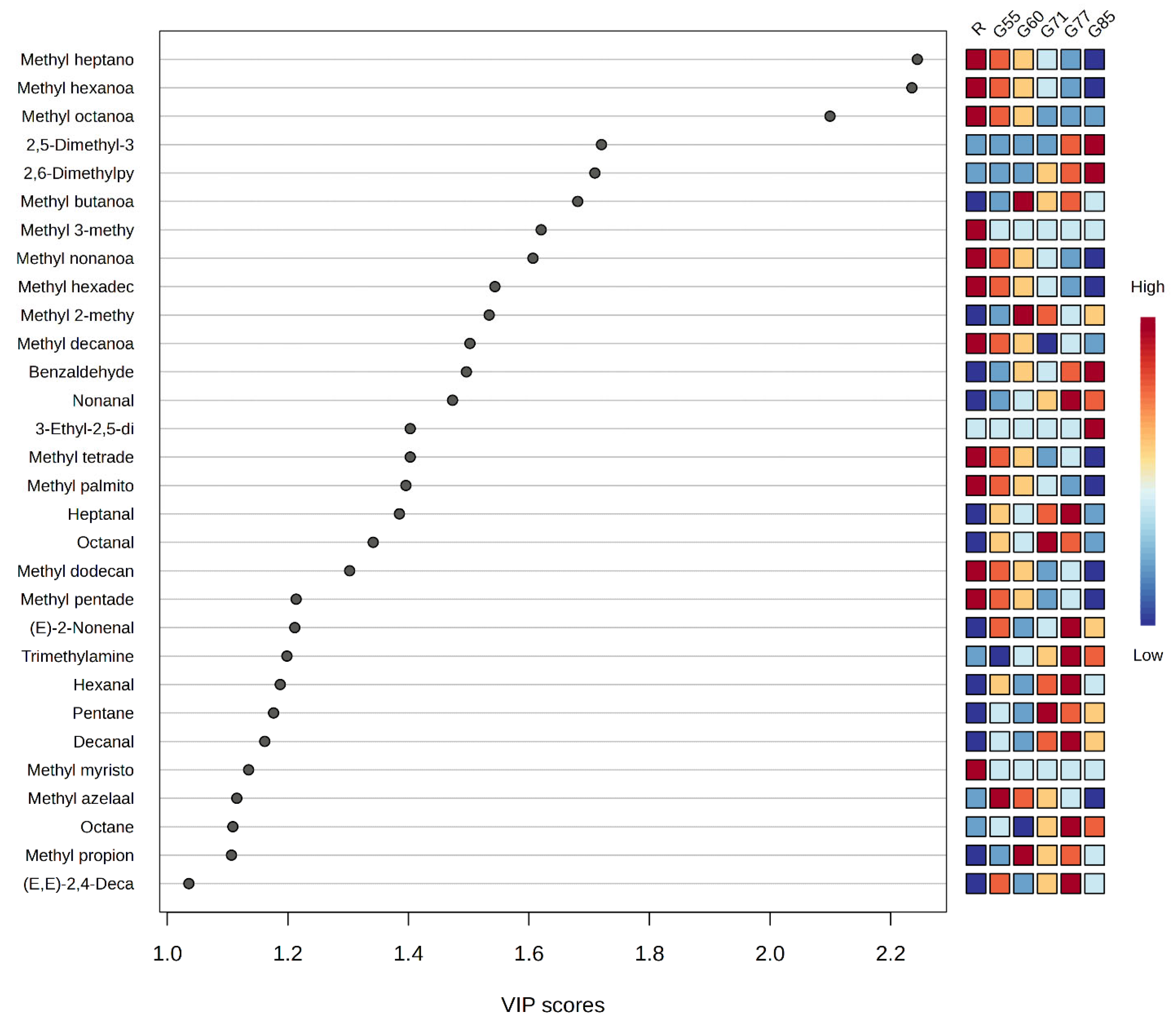 | Decanal | 112-31-2 | 1209 | 1205 | 0.35 | 0.58 | 0.68 | 0.71 | 0.67 | 0.70 | <0.01 | |