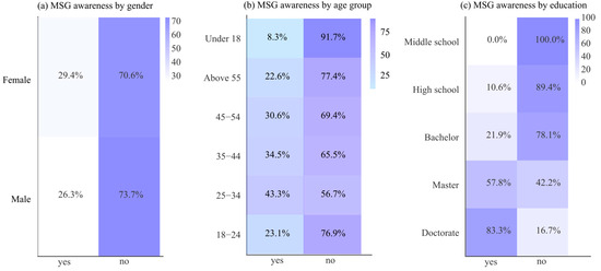 Associations of MSG awareness with demographic factors: (a) gender, (b) age group, and (c) education level.