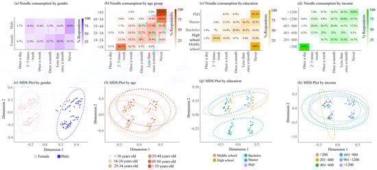 Visualization of instant noodle consumption across demographic groups. Subfigures (a–d) present heatmaps showing the percentage distribution of consumption by gender (a), age group (b), education level (c), and income level (d). Subfigures (e–h) display the corresponding Multidimensional Scaling (MDS) plots for gender (e), age (f), education (g), and income (h), highlighting patterns and similarities in consumption behavior within each demographic category.