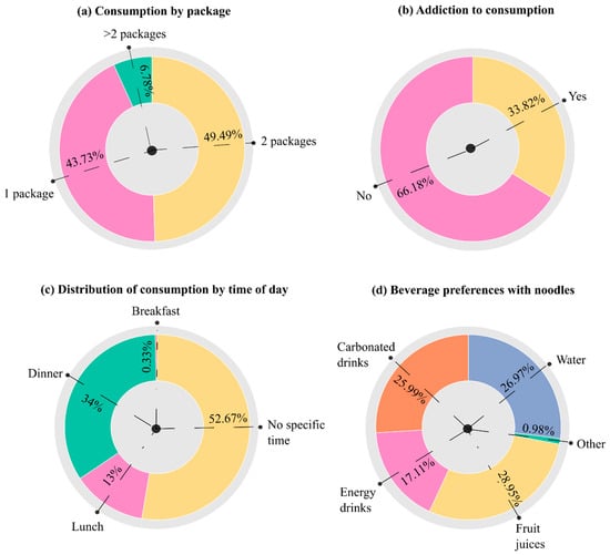 Portion sizes were generally moderate, as nearly all participants reported consuming one or two packages per meal (Figure 4a), while only a small proportion (6.78%) consumed more than two packages. Notably, about one-third of respondents reported feeling addicted to instant noodles, and this sense of dependency was strongly associated with both higher consumption frequency and larger portions. These results suggest a behavioral or emotional component to noodle consumption, where individuals may use noodles as a comfort food or habitual meal rather than due to physical craving. The lack of a fixed consumption schedule for most participants, with dinner being the most common time when noodles were eaten, reinforces this interpretation. These findings are consistent with Babcock et al. [38], who also found irregular noodle consumption patterns among university students. This irregular, opportunistic consumption pattern suggests that many people turn to noodles when they are short on time or energy, often in the evening after a busy day.