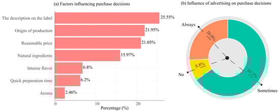 Regarding purchasing decisions, the description on the label emerged as the most decisive factor, followed by the origin of production and reasonable price. Natural ingredients also played a considerable role, whereas sensory attributes such as intense flavor, quick preparation time, and aroma were less influential (Figure 6).