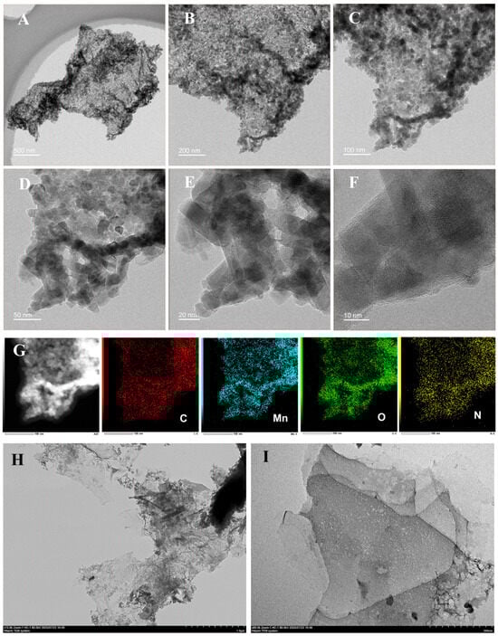 (A–E) TEM images and (F) HRTEM images of MnO2/KLSC@Fe3C; (G) EDS-mapping images of MnO2/KLSC; (H,I) TEM images of KLSC.