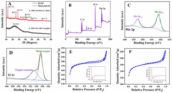 (A) XRD patterns of KLSC and MnO2/KLSC; (B) XPS spectrum of MnO2/KLSC; (C,D) fine diluted Mn 2p and O1s XPS spectra of MnO2/KLSC; (E,F) nitrogen adsorption–desorption isotherms of KLSC and MnO2/KLSC (the insert images are the corresponding pore diameter distribution curves).