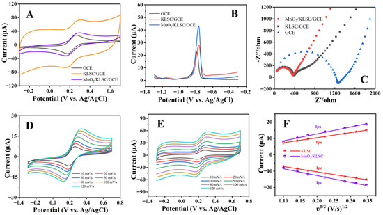 (A) CV curves of bare GCE, KLSC/GCE, and MnO2/KLSC/GCE in 1.0 mmol/L [Fe(CN)6]2+/3+ and 0.5 mol/L KCl solution; (B) SWASV curves and (C) EIS spectra of GCE, KLSC/GCE, and MnO2/KLSC/GCE in 0.04 M BR (pH = 5) containing 10 µM Cd2+; CV curves of (D) MnO2/KLSC/GCE and (E) KLSC/GCE in a solution of 1.0 mmol/L [Fe(CN)6]2+/3+ and 0.5 mol/L KCl solution at different scanning rates (10−120 mV/s); (F) corresponding linear plots of the peak current versus the square root of scanning rate (ʋ1/2).