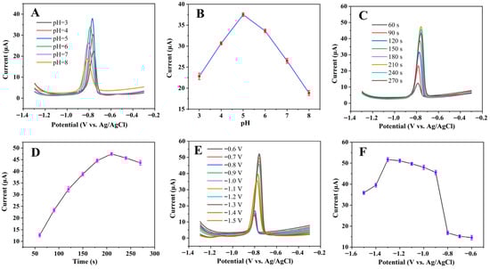 The pH value of BR, deposition time, and deposition potential in the electrochemical test conditions were first optimized, with the results displayed in Figure 4A–F. The peak current first increases and then decreases in the pH range of 3 to 8. The maximum current was obtained at pH 5.0. When the deposition time increased from 60 s to 210 s, the peak current increased. However, when the deposition time continued to increase to 270 s, the peak current decreased instead. For the deposition potential, from −0.6 V to −0.9 V, the peak current increased sharply. While between −0.9 V and −1.3 V, the peak current became relatively stable; it reached the maximum current at −1.3 V. When the deposition potential was greater than −1.3 V, the peak current dropped sharply. Thus, the optimal pH was 5.0, and the optimal deposition time and deposition potential were 210 s and −1.3 V, respectively. All the subsequent tests were conducted under the optimal experimental conditions.