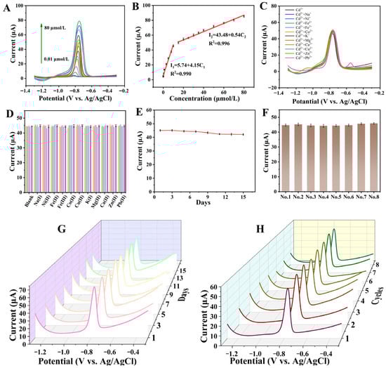 (A) SWASV curves of Cd2+ on MnO2/KLSC/GCE in 0.04 M BR with the concentration ranging from 0.01 to 80.0 μmol/L; (B) Ipa versus Cd2+ concentration; (C) the SWASV curves of 10 μmol/L Cd2+ on MnO2/KLSC/GCE in 0.04 M BR containing 100 μmol/L different interfering ion and (D) the corresponding peak current response histogram; (E) the peak current of 10 μmol/L Cd2+ on MnO2/KLSC/GCE in 0.04 M BR pH = 5 on different days (n = 5) and (G) the SWASV curves; (F) the peak current of one single electrode (n = 8) used 8 consecutive times and (H) the SWASV curves.