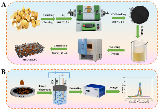 (A) Preparation procedure of MnO2/KLSC and (B) the MnO2/KLSC/GCE sensor fabrication for the detection of Cd2+.