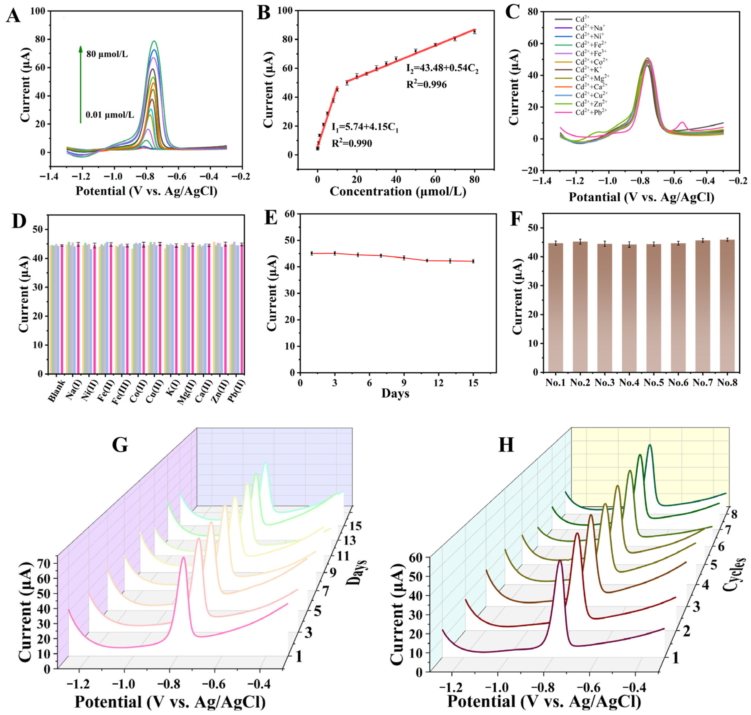 - Zheng, X.; Han, Y.; Liu, Z.; Liang, S.; Wang, C.; Guo, Y. Electrochemical sensor built on graphene@ iron-based metal-organic frameworks for simultaneous detection of Cd2+ and Pb2+. Electroanalysis 2025, 37, e12002. [Google Scholar] [CrossRef]