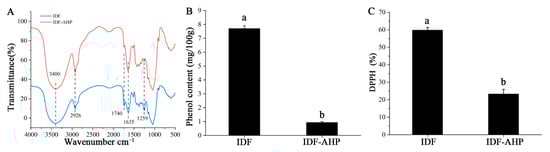 FT-IR spectrum, bound phenol content, and antioxidant activity of IDF and IDF-AHP. (A) FT-IR spectroscopy; (B) combined phenol content; (C) DPPH radical scavenging activity. Data are expressed as mean ± SD (n = 8). Different letters indicate significant differences (p < 0.05).
