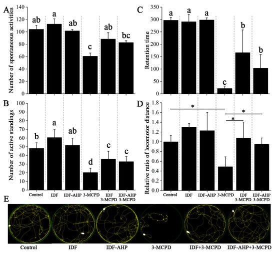 Alleviating effects of IDF and IDF-AHP on 3-MCPD-induced motor impairment. (A) Number of spontaneous activities; (B) number of active standings; (C) retention time; (D) locomotor distance; (E) movement trajectory diagram. Data are expressed as mean ± SD (n = 8). Different letters or * indicate significant differences (p < 0.05).