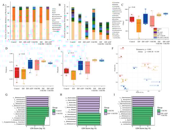 β-diversity is an macro-metric marker used to assess differences in microbial communities between samples [39]. Significant differences in microbial composition were observed among the groups (p = 0.001, Adonis, R2 = 0.349). In the PCoA plot, the IDF+3-MCPD group showed slight separation from the 3-MCPD group, whereas the IDF-AHP group exhibited distinct separation from the 3-MCPD group (Figure 6F).