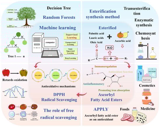 This study is dedicated to summarizing and performing an in-depth analysis of the antioxidant properties of ascorbic acid fatty acid esters. The esterification reaction mechanism of ascorbic acid with palmitic acid, lauric acid, and oleic acid in food systems was elaborated in detail, and its antioxidant mechanism was discussed in depth. The free radical scavenging mechanism and oxidative inhibition effect of two mainstream determination methods, DPPH and ABTS, were analyzed. Esterification, as a core organic synthesis reaction, is widely used in the production of food antioxidants, pharmaceutical ingredients, chemical polymers, and cosmetic oil-based matrices. At the same time, in view of the wide application of machine learning as a multidisciplinary core technology, this paper selects free radical scavenging rate and esterification yield as characteristic parameters and normalizes the offspring into random forest model training to achieve accurate prediction of antioxidant performance. Finally, in the future, it is necessary to expand the data set, optimize the model structure, explore multi-model fusion to improve the prediction effect, and promote the application of machine learning in the screening design of new antioxidants and the optimization of green synthesis processes to promote the intelligent and sustainable development of food antioxidant research.