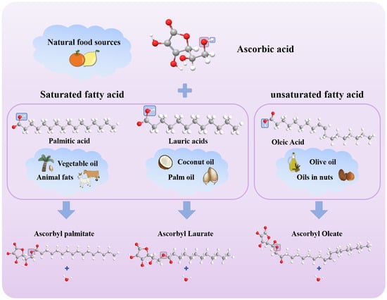 Although free VC has high antioxidant activity, its chemical properties are unstable and easy to oxidize and inactivate. Fatty acids (FA) themselves have no significant antioxidant activity. However, the ester products formed by the esterification of FA with VC can achieve synergistic enhancement of antioxidant efficiency through a dual mechanism [5]. The hydrophobic interaction of fatty acid chains can wrap the active hydroxyl groups (-OH) in VC molecules, reduce the contact probability of active sites with oxygen and free radicals, and thus reduce the oxidation inactivation rate of VC. FA can be divided into saturated fatty acids (SFA) and unsaturated fatty acids (UFA). There is no double bond in SFA, and there are single bonds between carbon atoms. Common SFAs are palmitic acid, lauric acid, and stearic acid, etc. UFAs are divided into monounsaturated fatty acids (MUFA) and polyunsaturated fatty acids (PUFA) according to the double bond. MUFAs contain one double bond, and PUFAs contain two or more double bonds. Common UFAs are oleic acid, linoleic acid, α-linolenic acid, γ-linolenic acid, etc. [6]. FAs are the key energy storage molecules in the human body and perform a variety of important functions throughout the life cycle. As the core component of lipids, FAs not only participate in energy metabolism and maintain the stability of cell membranes but also play a regulatory role in various physiological processes of cells [7].
