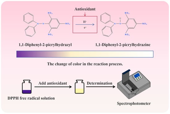 A free radical is a special chemical entity, and its core feature is that it has an unpaired electron. The latter has unique spin quantum mechanical properties, which endow free radicals with high reactivity and special chemical behavior, which makes free radicals prone to oxidation reactions [56]. Since free radicals have harmful effects on food, free radical activity should be eliminated to ensure food quality and delay their oxidative deterioration. Because the chemical structure of DPPH contains a nitrogen atom, the unpaired electrons on the nitrogen atom give DPPH unique free radical properties, so it has become a stable free radical molecule widely used in the study of antioxidant properties. DPPH has a strong absorption at 517 nm. After being reduced by antioxidants, it fades from deep purple to light yellow and finally becomes colorless (Figure 3). The ability of the sample to scavenge free radicals can be quickly and sensitively evaluated by measuring the degree of absorbance decline. Many assays are used to evaluate the antioxidant activity of herbal extracts or phenolic compounds [52].