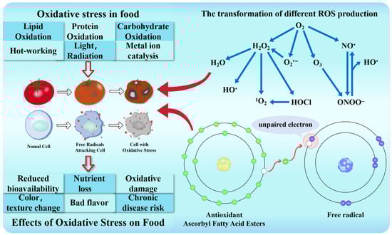 As shown in Figure 4, the conversion processes between different ROS forms a complex redox network, maintaining the balance between intracellular oxidation and antioxidation. When this balance is broken, it will lead to oxidative stress. The natural oxidation of food components and the oxidation during processing will lead to oxidative stress in food, which will lead to poor flavor, color, and texture changes; loss of nutrients; reduced bioavailability; and adverse effects on human health.