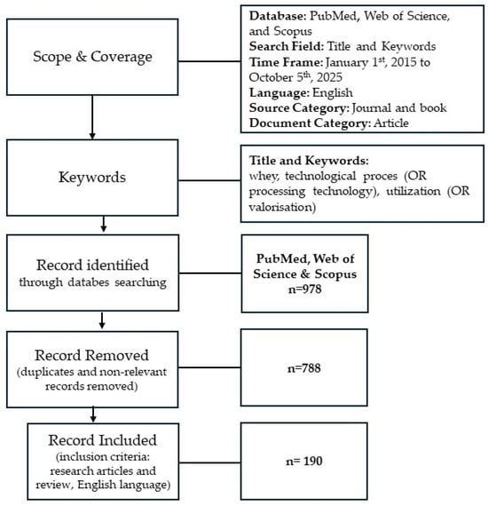 All data presented in this narrative review were summarized from the references, including scientific journals and book chapters. The references were searched in the databases PubMed, Web of Science, and Scopus, using the keywords: “whey” AND, “technological process” (OR “processing technology”), AND “utilization” (OR “valorization”). To search for the maximum number of relative references, the keyword was set as “whey and technological process, and/or utilization”, and the search scope was limited to the years 2015 to October 2025. During the period from 1 October 2025 to 5 October 2025, we identified 978 items in these databases, but after analysis, we excluded those (n = 798) that did not meet our inclusion criteria: time period, English language, and that were duplicated in both databases. Ultimately, we selected 164 items for review (Figure 1).