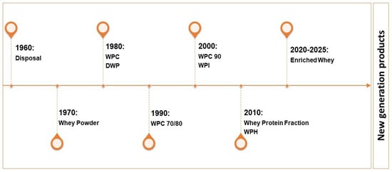 Figure 2. Evolution of whey processing (1960–2025). Explanatory Note: WPC—Whey Protein Concentrate, DWP—Demineralized Whey Powder, WPI—Whey Protein Isolate, WPH—Whey Protein Hydrolysate.