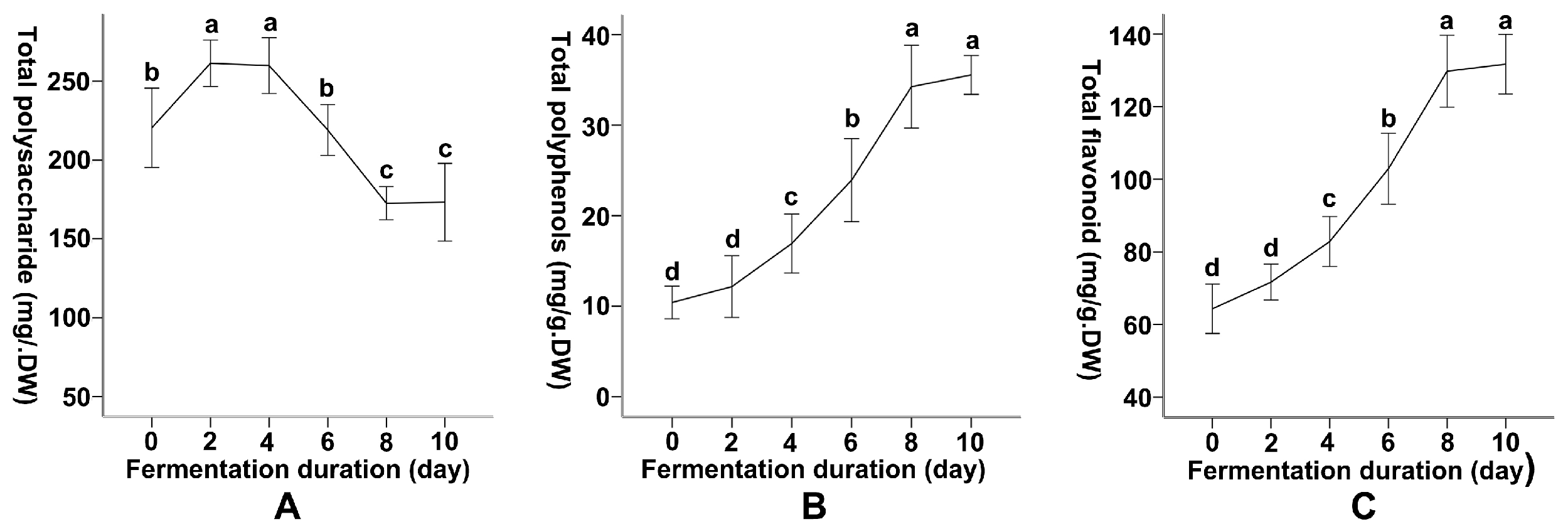 | Leaf Fermentation Duration (Day) | Total Polysaccharide (mg/g·DW) | Total Polyphenols (mg/g·DW) | Total Flavonoid (mg/g·DW) |