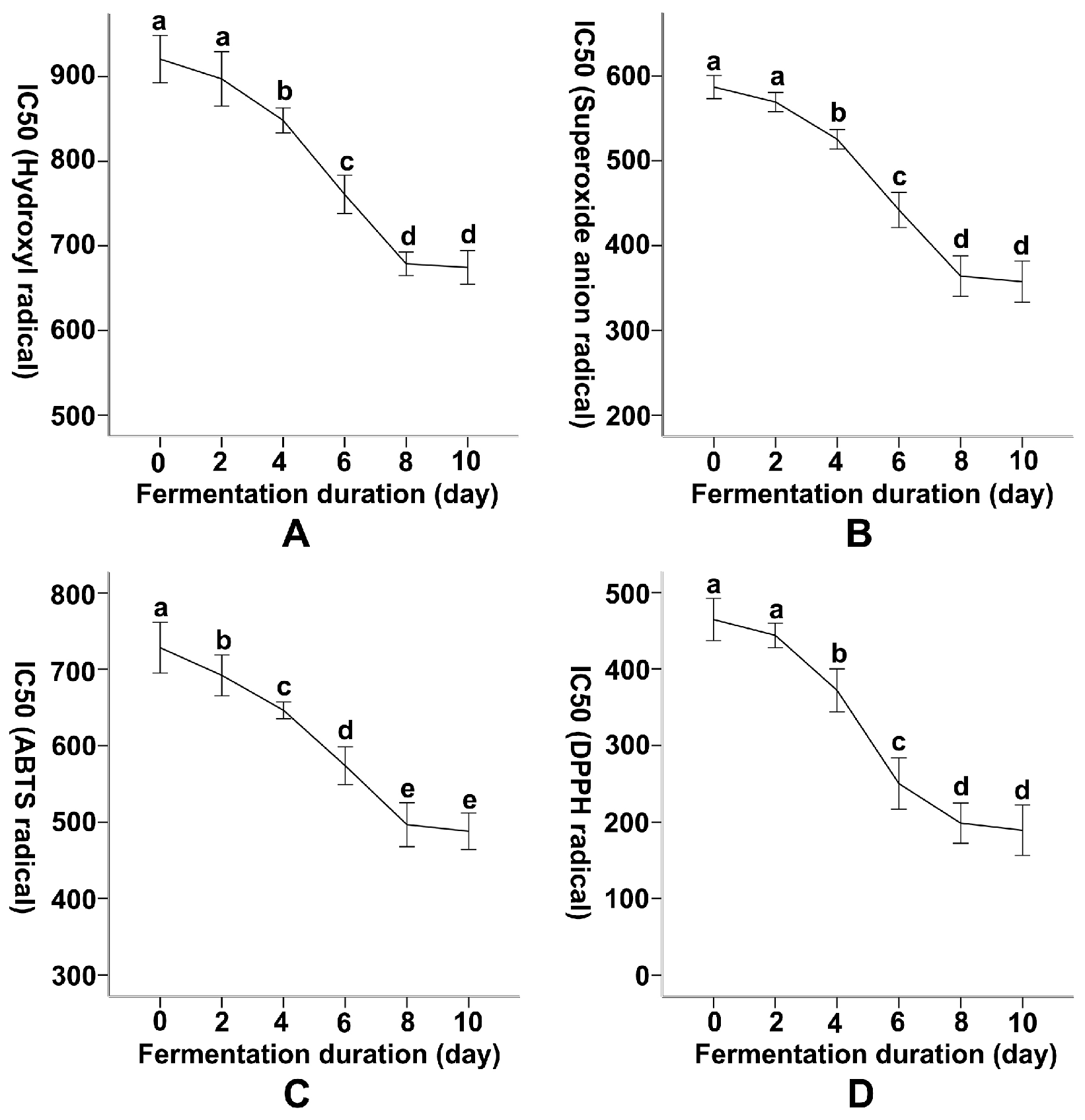 | Leaf Fermentation Duration (Day) | IC50 (Hydroxyl Radical) | IC50 (Superoxide Anion Radical) | IC50 (ABTS Radical) | IC50 (DPPH Radical) |
