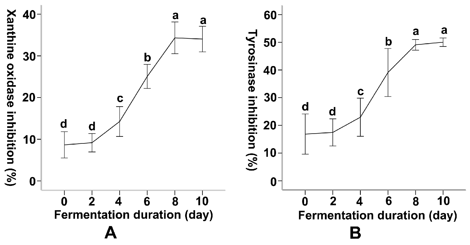 | Leaf Fermentation Duration (Day) | Xanthine Oxidase Inhibition (%) at 100 μg/mL | Tyrosinase Inhibition (%) at 100 μg/mL |