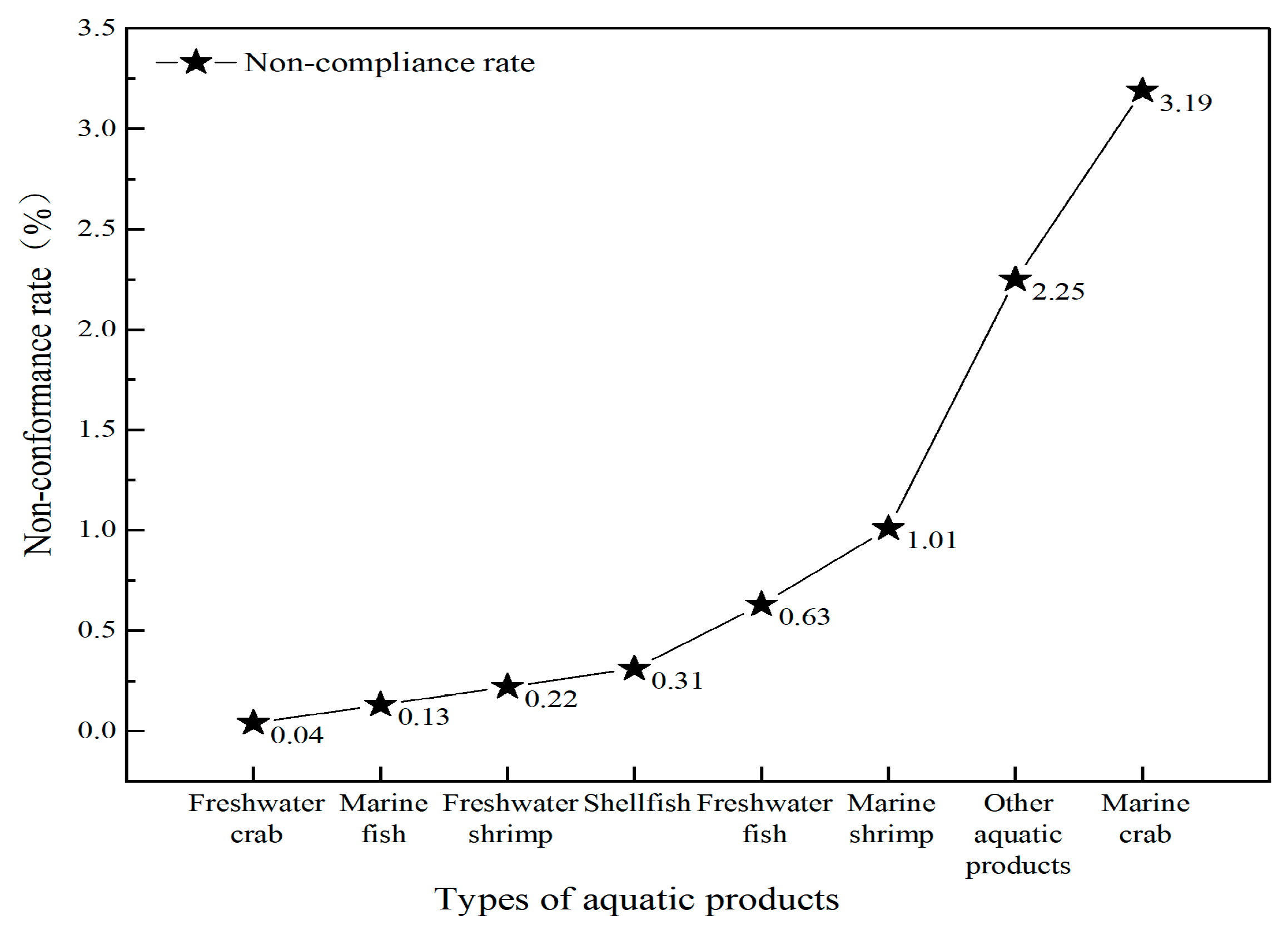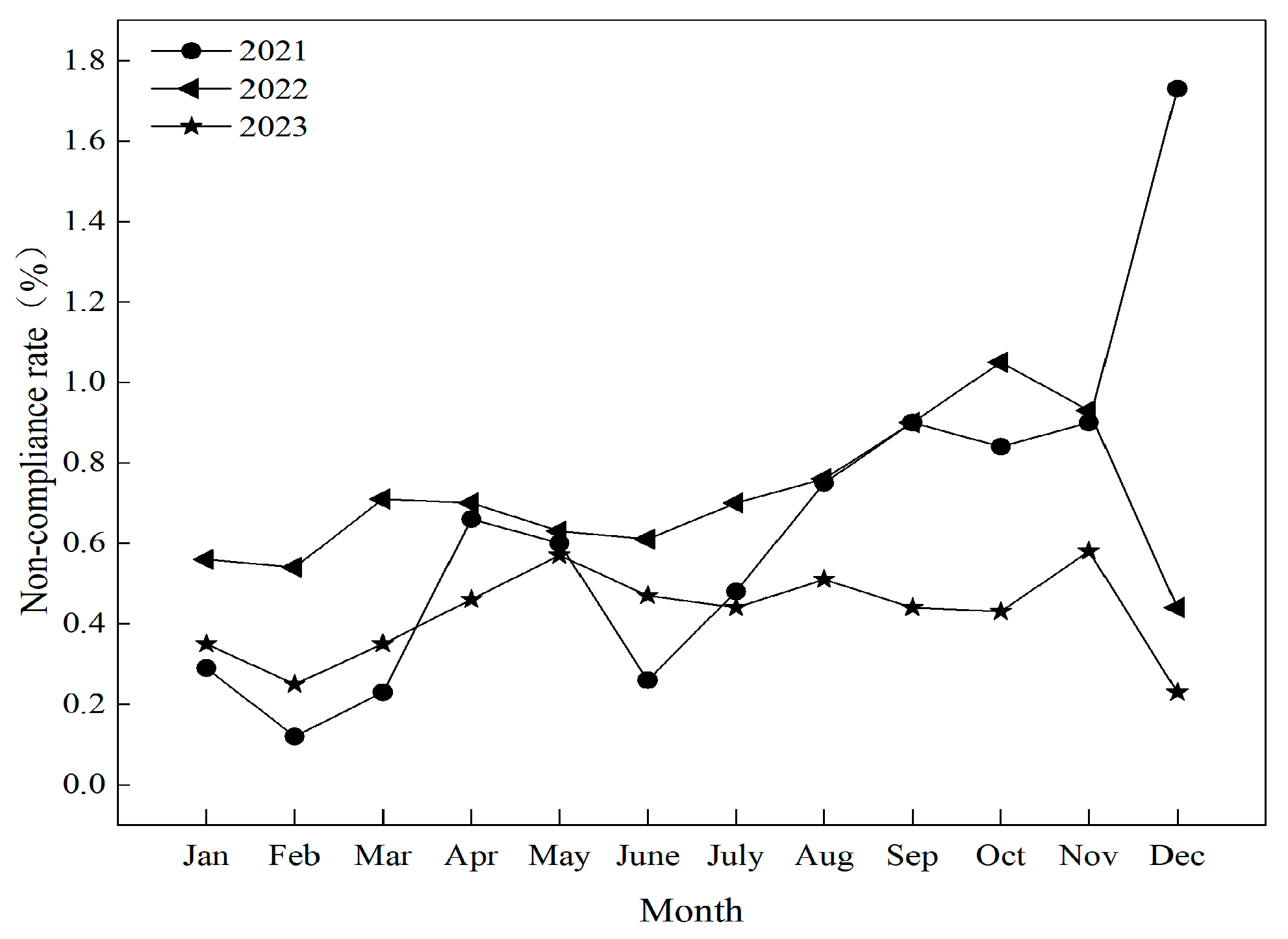A temporal analysis of non-compliant cases in aquatic products from 2021 to 2023 (Figure 5) reveals a general trend of gradual increase in non-compliance across different months, exhibiting a distinct seasonal pattern. The non-compliance rate was notably higher in summer and autumn compared to winter and spring. Overall, the non-compliance rate in the second half of the year was higher than that in the first half, exhibiting a gradual upward trend, though the overall fluctuation remained relatively small. In 2021, the lowest non-compliance rate was 0.12% in February, and the highest was 1.73% in December, indicating significant fluctuation. In 2022, the lowest rate was 0.44% in December, and the highest was 1.05% in October. In 2023, the non-compliance rate was lowest in December at 0.23% and highest in November at 0.58%, demonstrating relatively minor fluctuation.