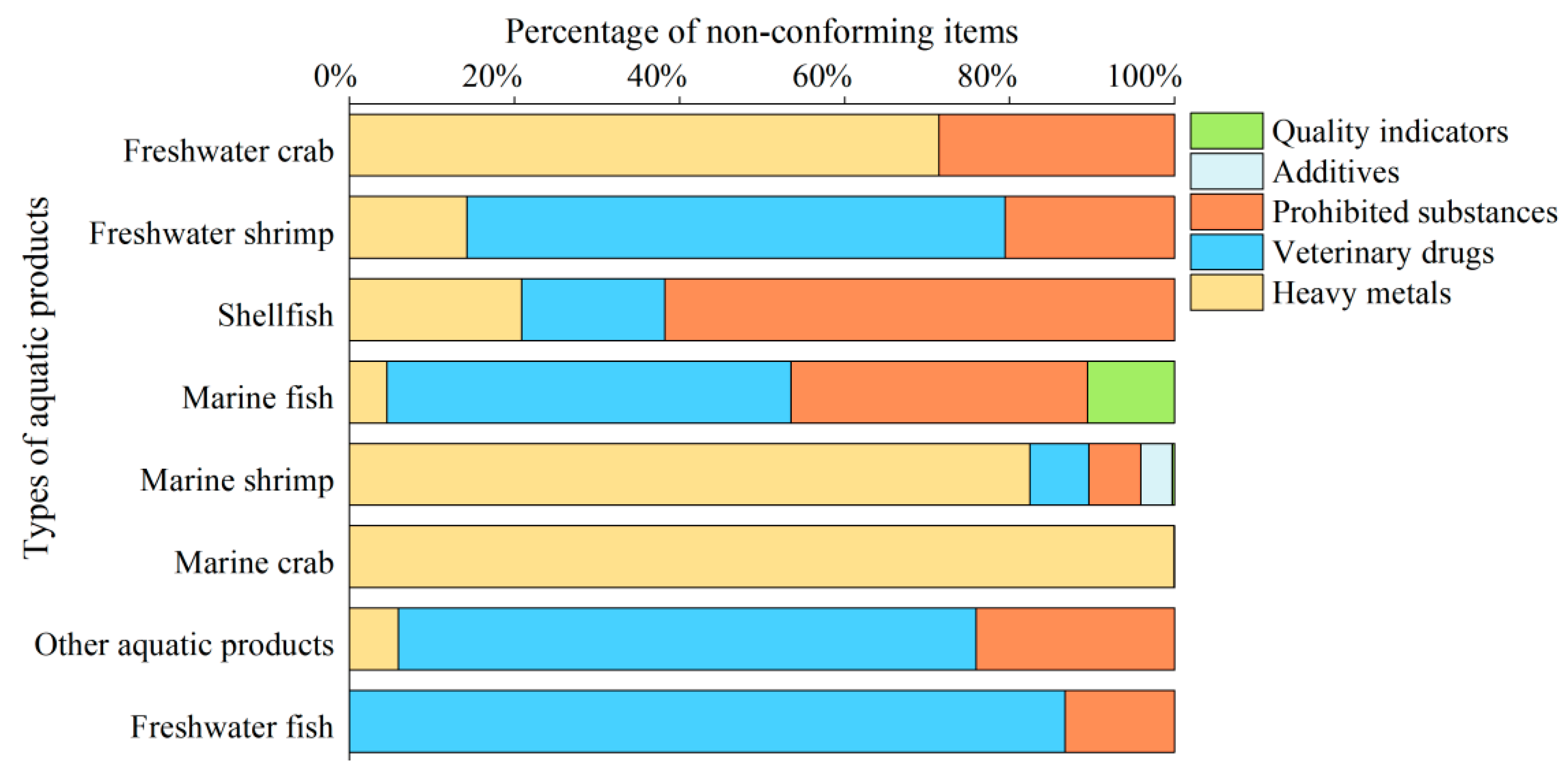 An analysis of non-compliant aquatic products (Figure 1) revealed that the highest non-compliance rate was observed in seawater crabs (3.19%), followed by other aquatic products (2.25%), and the lowest rate was freshwater crabs (0.04%). A detailed examination of non-compliant items across various categories of aquatic products was conducted, with the proportions of each non-compliant item by category illustrated in Figure 2. The primary non-compliant items in freshwater crab were identified as heavy metals and prohibited drugs; in freshwater shrimp, shellfish, and other aquatic products, the main items were heavy metals, veterinary drugs, and prohibited drugs. For seawater fish, the predominant issues were heavy metals, veterinary drugs, prohibited drugs, and quality indicators, while seawater shrimp primarily exhibited concerns related to heavy metals, veterinary drugs, prohibited drugs, and additives. Seawater crabs were mainly associated with heavy metals, and in freshwater fish, veterinary drugs and prohibited drugs were the primary concerns. The distribution of non-compliant items detected in different categories of aquatic products is presented in Table 4. For seawater crabs, cadmium was the primary concern, while other aquatic products predominantly showed issues with enrofloxacin, furazolidone metabolites, and nitrofurazone metabolites; for seawater shrimp, it was mainly cadmium and enrofloxacin; freshwater fish was mostly associated with enrofloxacin, diazepam, and malachite green, while shellfish primarily contained chloramphenicol and cadmium; both freshwater shrimp and seawater fish had significant levels of enrofloxacin and furazolidone metabolites, whereas freshwater crabs primarily contained cadmium, nitrofurazone metabolites, and furazolidone metabolites.