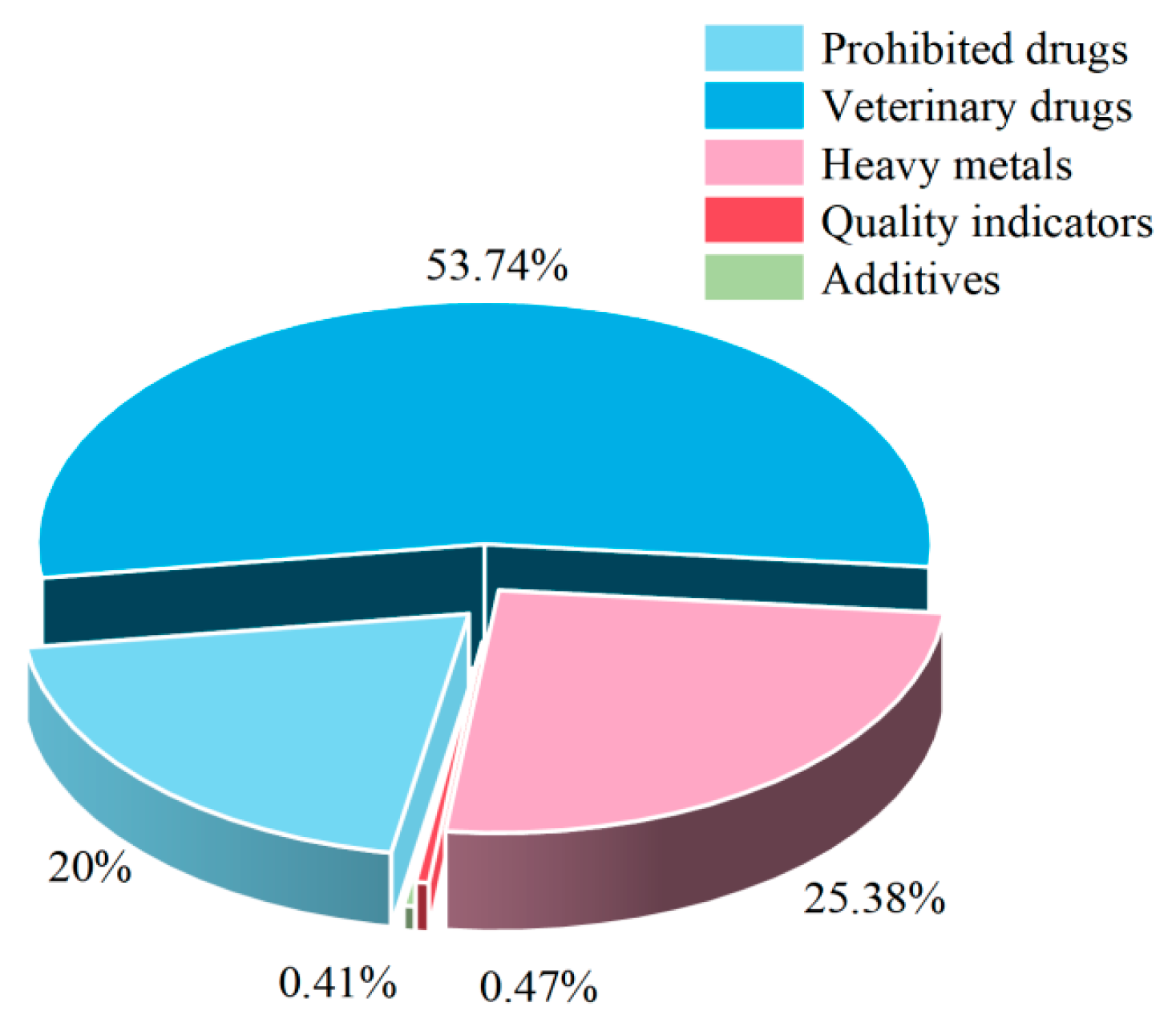 An analysis of the non-compliant items in aquatic products revealed that veterinary drugs constituted the largest proportion at 53.74%, followed by heavy metals at 25.38%. No non-compliant cases were detected for organic pollutants. Based on the risk classification of aquatic products and the identified non-compliant items in aquatic products (Figure 3), the primary focus should be on veterinary drugs and heavy metals. Among veterinary drugs (Figure 4a), particular attention should be paid to the illegal use of enrofloxacin, which accounted for 92.96% of the non-compliant cases. Regarding heavy metals, only cadmium was found to be non-compliant. In combination with the risk classification, significant attention should be paid to cadmium and methylmercury. The inspection items under prohibited drugs (Figure 4b) all presented relatively high risks and require close attention. Non-compliance in quality indicators was detected for histamine and total volatile basic nitrogen; considering the risk classification, total volatile basic nitrogen requires particular attention. In the category of additives, only sulfur dioxide was found to be non-compliant, which should be closely monitored in light of the risk classification.