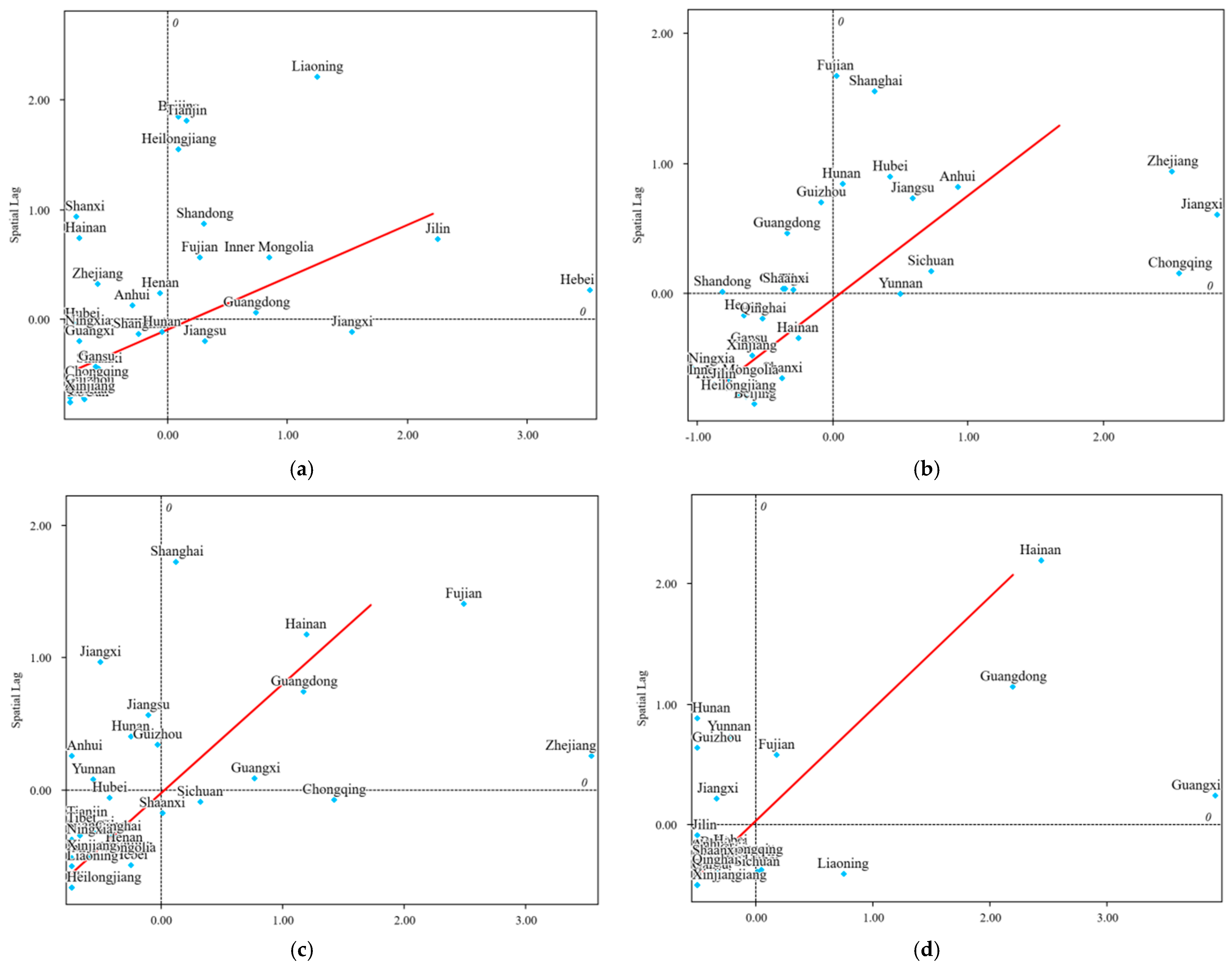 When there is a global Moran’s I index with statistical significance (p < 0.05), further analysis of the local Moran’s I index can be conducted to investigate whether there is regional spatial clustering in the study subjects. A local spatial autocorrelation analysis was performed on cadmium, enrofloxacin, furazolidone metabolites, and chloramphenicol in aquatic products across provinces in China. First of all, the p-values of the local Moran’s I index were analyzed. If the p-value is less than 0.05, it indicates the presence of a regional spatial correlation; conversely, if the p-value is greater than 0.05, it indicates the absence of spatial correlation (Table 6). A high–high clustering signifies that both the province and its neighboring provinces were at a “high level”; a low–high clustering meant that the province was at a “low level”, but its neighboring provinces were at a “high level”; a low–low clustering indicated that both the province and its neighboring provinces were at a “low level”; a high–low clustering denoted that the province was at a “high level”, but its neighboring provinces were at a “low level”. For the Moran scatter plot, the X-axis (z-score of outliers) represented the distance between data values and the mean; therefore, the data points located further to the right indicated a higher non-compliance rate. The Y-axis (Spatial Lag) represented the spatial lag value, with higher values indicating that the neighbors (surrounding areas) of the study subject had higher non-compliance rate.