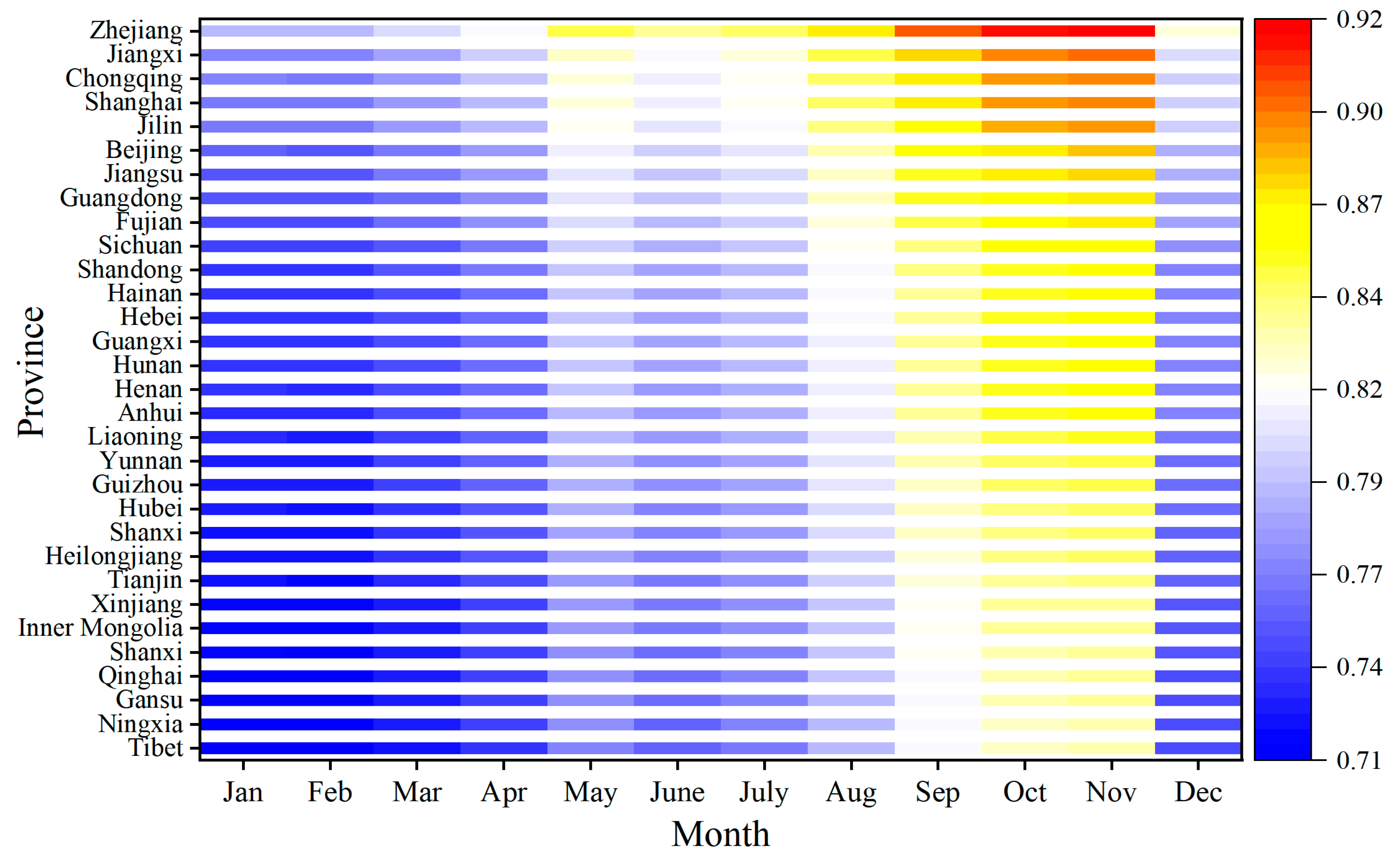 Through statistical analysis, the non-compliance rates of aquatic products across provinces and each month were yielded, and thus the risk adjustment factors for different provinces and months were obtained, as shown in Equations (16)–(18) [36]. In the formula, P is the risk adjustment factor for a province; Pf is the number of non-compliant cases in that province; Qf represents the total number of non-compliant cases for food products; M denotes the risk adjustment factor for a month; Mf signifies the total number of non-compliant cases across all provinces for that month. The maximum relative proximity was taken as the baseline risk for the food, to which a risk adjustment factor was added to calculate the final spatiotemporal risk value for the aquatic product.