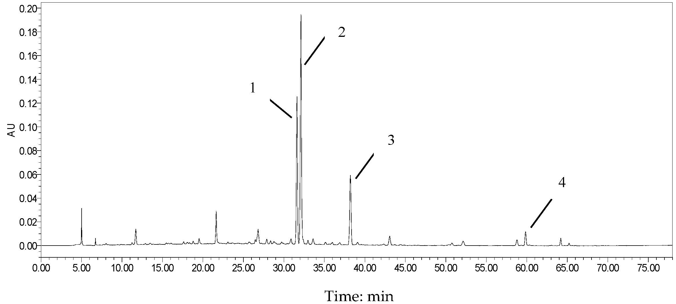 - Wang, L.J.; Lin, L.; Wei, H.; She, D.; Huang, X.L. HPLC fingerprint of citri grandis exocarpium from different cultivars. China J. Chin. Mater. Medica 2012, 37, 3092–3096. [Google Scholar]