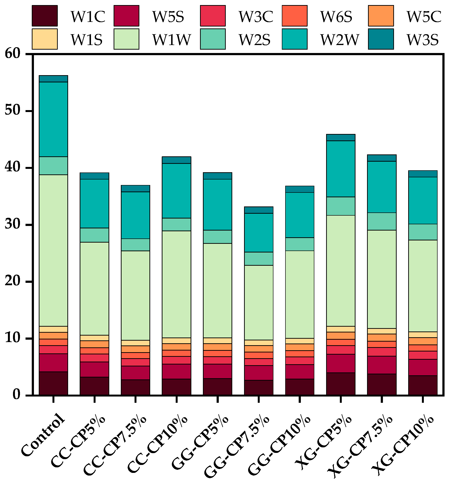 - Linlaud, N.; Ferrer, E.; Puppo, M.C.; Ferrero, C. Hydrocolloid Interaction with Water, Protein, and Starch in Wheat Dough. J. Agric. Food Chem. 2011, 59, 713–719. [Google Scholar] [CrossRef]