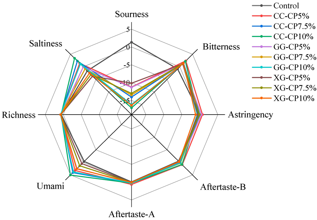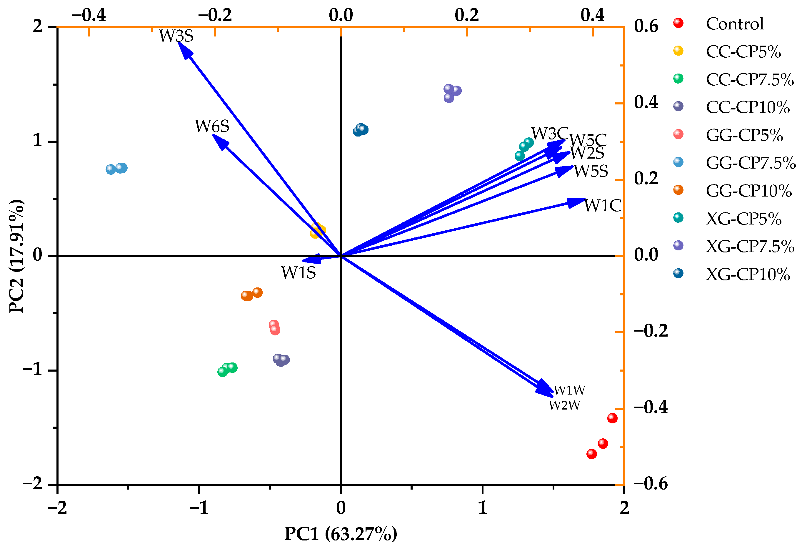 | XG-CP10% | 4.12 ± 0.00 c | 57.59 ± 0.05 cd | 2.85 ± 0.01 b | 16.22 ± 0.29 cd | 61.82 ± 0.83 b | 5.42 ± 0.08 e |