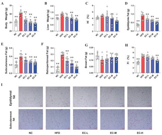 As shown in Figure 1, HFD remarkably increased the body weight and weights of the epididymal, subcutaneous and retroperitoneal fat in comparison with NC mice, respectively (p < 0.01). Furthermore, no significant difference in food intake was observed among the five groups of mice (Figure S1). The EC intervention effectively suppressed the HFD-induced increases in the body and liver weight, and contributed to significant reductions in epididymal, subcutaneous and retroperitoneal fats in HFD mice (p < 0.05). Meanwhile, the HFD mice showed a decrease in the brown fat (Figure 1G, p > 0.05) and an increase in the hepatosomatic index (HI) (Figure 1C, p > 0.05) and fat index (FI, p < 0.01, Figure 1H), when compared to the NC mice. Oral EC supplementation counteracted the significant increases in HI and FI induced by HFD (p > 0.05). Furthermore, the treatment also mitigated the HFD-associated decrease in brown fat mass, albeit not significantly in this model (p > 0.05). In addition, H&E staining of epididymal and subcutaneous adipose in HFD mice showed a significant increase in the size of adipocyte cells, while the oral administration of EC at 104, 106 and 108 CFU mL−1 obviously decreased the adipocyte size of HFD mice (Figure 1I).