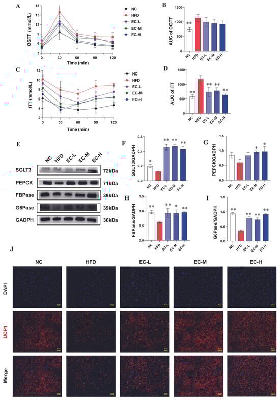 Figure 3. EC effectively improved glycolipid metabolism disorders in HFD mice. (A) OGTT, oral glucose tolerance test; (B) AUC of OGTT, (C) ITT, insulin sensitivity test; (D) AUC of ITT; (EI) immunoblots of G6Pase, FBPase, PEPCK and SGLT3 in the colon; (J) regulatory effects of EC on protein expressions of UCP1 in brown fat that were investigated by using the immunofluorescence staining. Data are presented as the mean ± standard deviation (SD). (*) p < 0.05 and (**) p < 0.01 vs. HFD group.