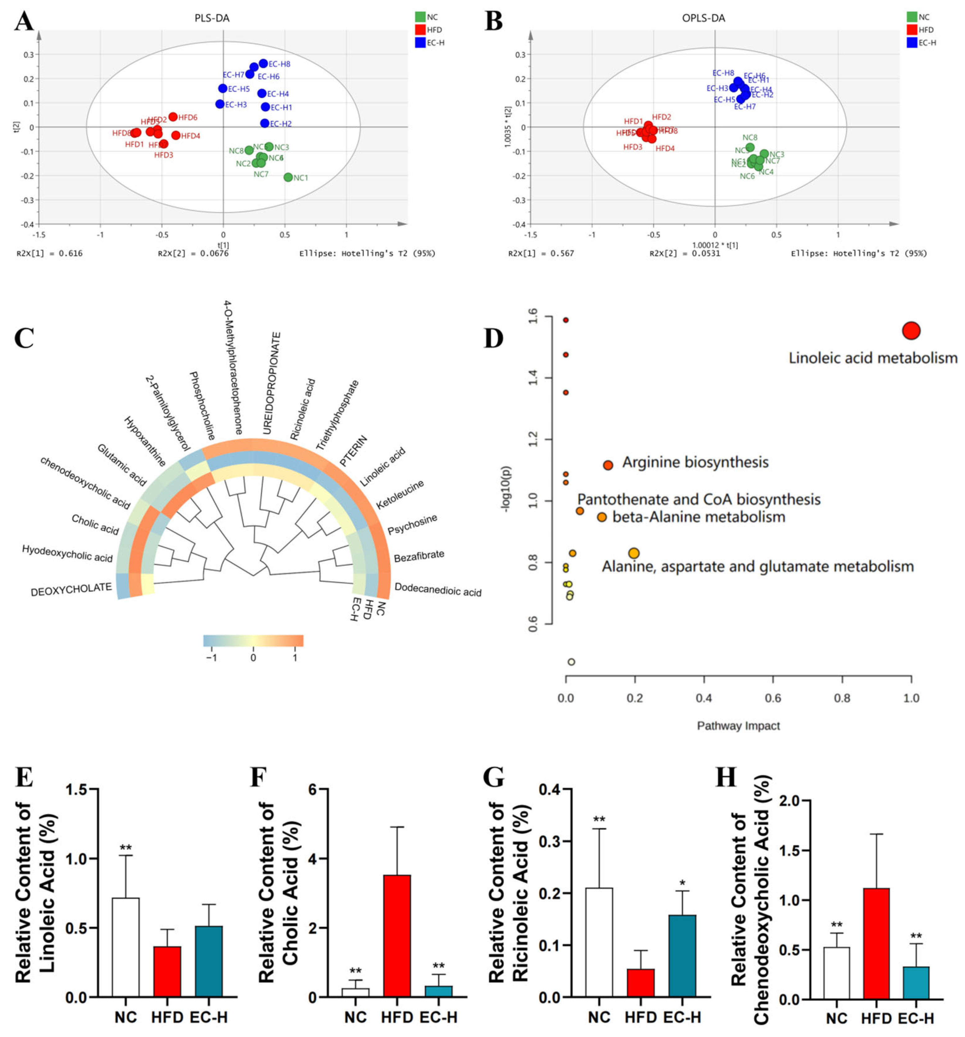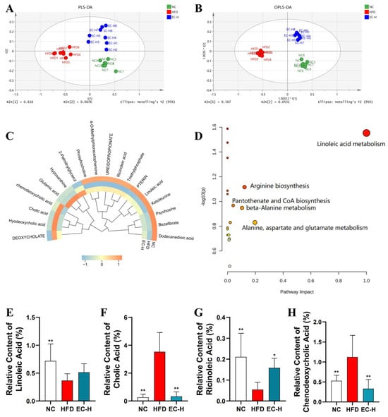 We further systematically analyzed the impact of EC-H on the metabolic profile of colonic contents in HFD-fed mice using UPLC-QTOF-MS technology. Multivariate statistical analysis (PLS-DA/OPLS-DA) revealed that the metabolic characteristics of EC-H group were significantly separated from the HFD group and more closely resembled the NC group levels (Figure 7A,B), indicating that EC effectively reversed HFD-induced metabolic disorders. Among the 70 identified differential metabolites (VIP > 1.0), 18 were annotated as human homologs. Heatmap analysis further confirmed the high similarity between the metabolic profiles of EC-H and NC groups (Figure 7C). KEGG pathway enrichment analysis demonstrated that these metabolites were primarily involved in key metabolic pathways, with linoleic acid metabolism showing the highest impact value, followed by arginine biosynthesis (Figure 7D). Specifically, compared with the HFD group (Figure 7E–H), the EC-H group showed significantly increased levels of linoleic acid and ricinoleic acid (p < 0.05), while the levels of cholic acid and chenodeoxycholic acid were significantly decreased (p < 0.01).