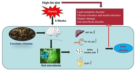 Recently, fungi have received considerable attention due to their potential health-promoting effects, especially their anti-obesity effect [14]. Eurotium cristatum (EC) is a predominant probiotic fungus that undergoes a unique “flowering” process and is traditionally used in the manufacturing of Fu brick tea (FBT) [15,16]. EC can secrete multiple active metabolites during the process of “flowering”, which is non-toxic and safe [17]. Studies indicate that FBT exerts protective effects against various metabolic disorders through multiple mechanisms, such as alleviating inflammation, regulating blood lipids and glucose, modifying gut microbial composition, and facilitating weight reduction [18,19,20]. However, it remains unclear whether Eurotium cristatum (EC), the predominant probiotic fungus contributing to the characteristic quality of FBT, is directly responsible for the tea’s reported anti-obesity effects. Our hypothesis posits that the anti-obesity properties of FBT are mediated by its resident fungus, EC. This could occur either through the survival and activity of live EC in the gut, or via the gut microbiota-modulating capacity of non-viable EC cells, ultimately leading to the observed metabolic benefits.