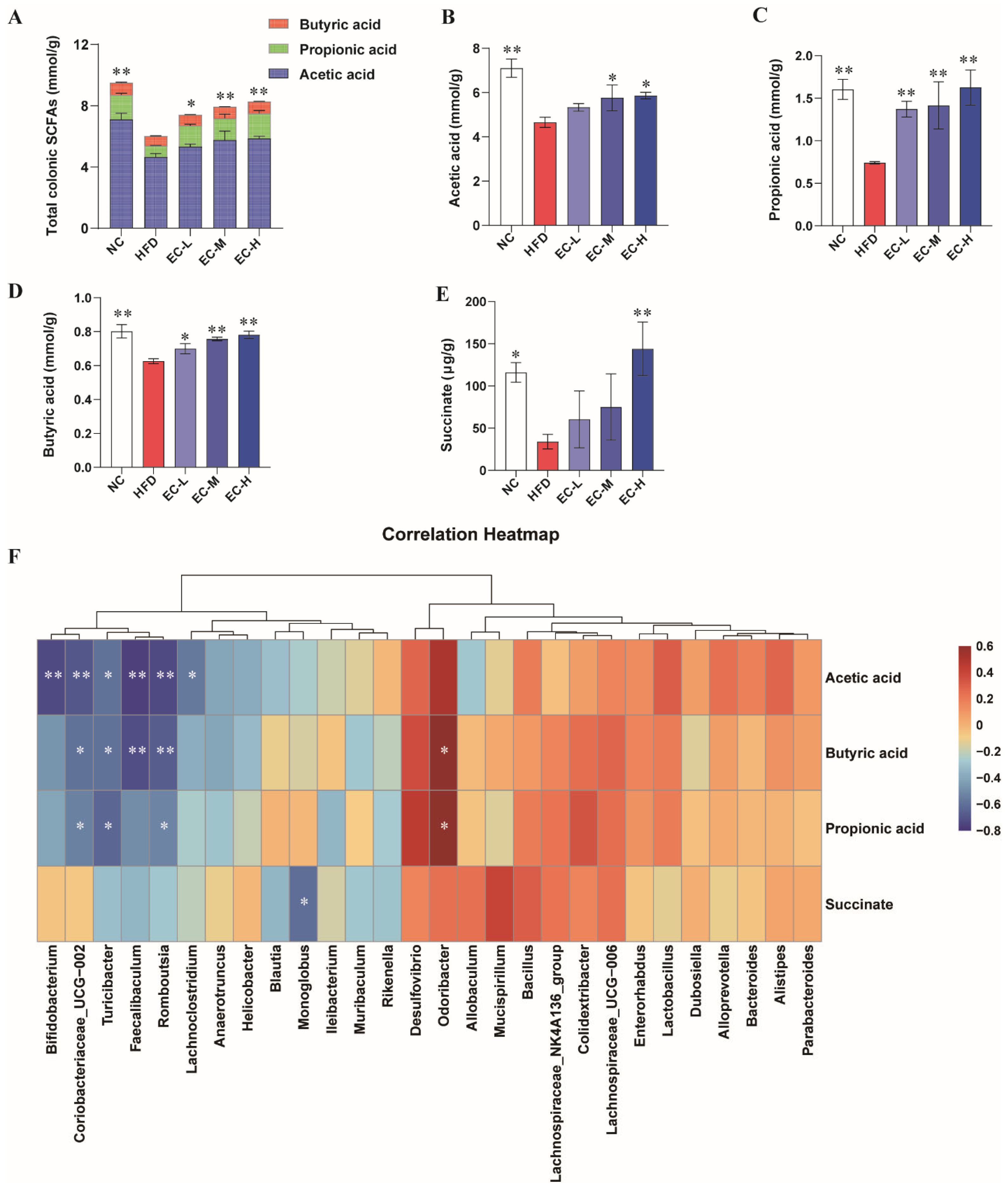 Figure 6. Effects of EC on SCFAs in the colon of HFD mice. (A) Total SCFAs levels, (B) acetic acid levels, (C) propionic acid levels, (D) butyric acid levels, (E) succinate levels. (F) Heatmap showing correlations of SCFAs and gut microbiota that were significantly affected by different treatments. Data are presented as the mean ± standard deviation (SD). (*) p < 0.05 and (**) p < 0.01 vs. HFD group.