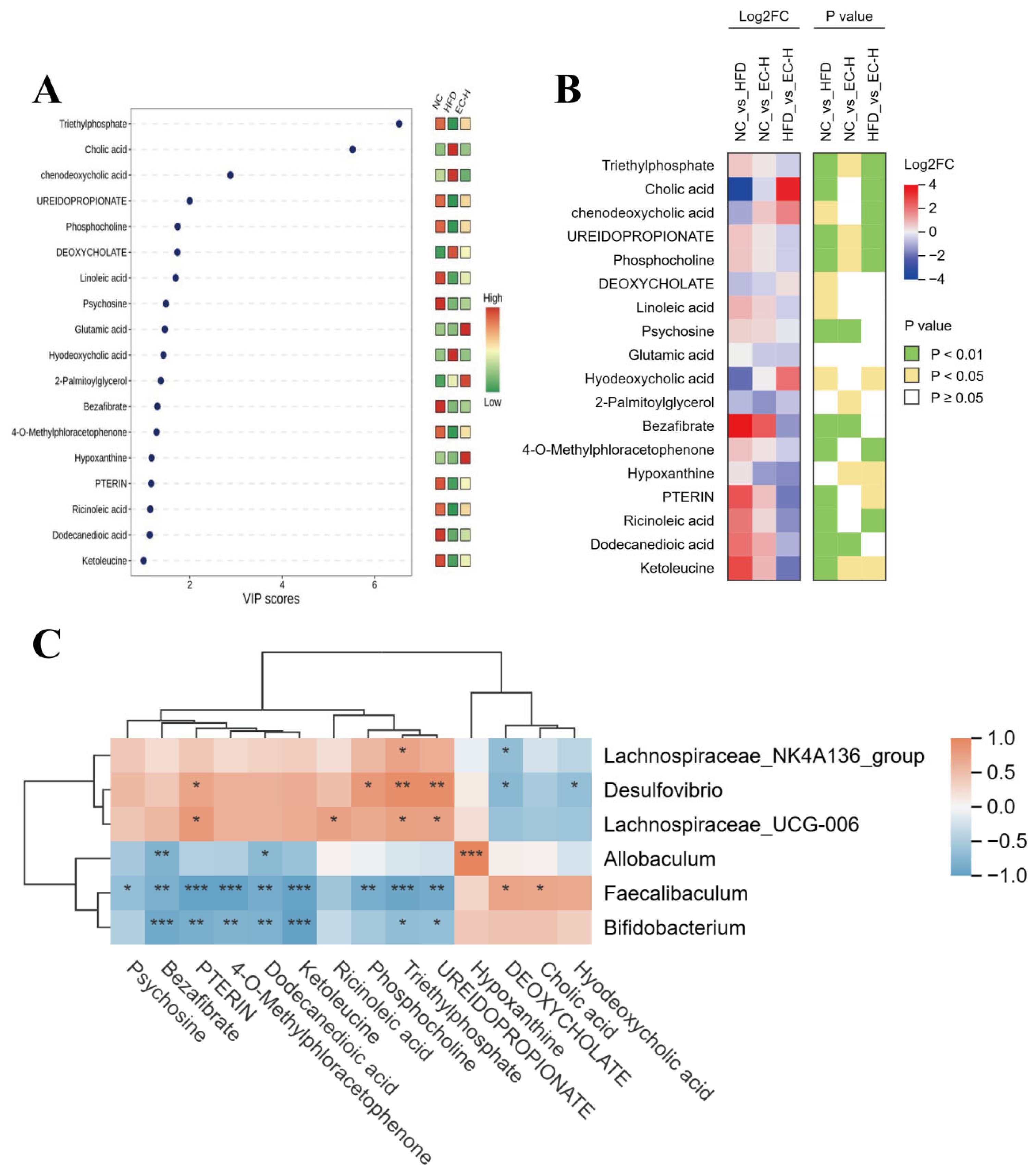 Figure 8. Effects of EC on colonic metabolites in obese mice. (A) Dot plot of differential metabolites with VIP values. (B) Combined heatmap of Log2FC values and p values. (C) Correlation analysis between the content of differential metabolites and the relative abundance of bacterial genera among different groups. Data are presented as the mean ± standard deviation (SD). (*) p < 0.05, (**) p < 0.01 and (***) p < 0.001 vs. HFD group.