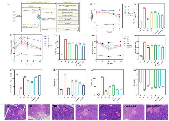 (A) Animal grouping and treatment, the effect of quercetagetin, lutein, and their combination on the (B) glucose content in the blood, (C) glycosylated serum protein content in serum, (D) blood glucose content recorded after glucose-administration for 0, 30, 60, 90, and 120 min, (E) area under the curve of oral glucose tolerance test (AUC-OGTT), (F) blood glucose content recorded after insulin-administration for 0, 30, 60, 90, and 120 min, (G) area under the curve of oral glucose tolerance test (AUC-ITT), (H) glycogen content in liver, (I) fasting insulin content in serum, (J) the insulin sensitivity index in serum, (K) the homeostasis model assessment-insulin resistance in serum, and (L) histopathological changes in pancreas (200× magnification). Red arrow: hydropic degeneration of islet cells and acinar cells; black arrow: pyknosis of islet cell nuclei; Light green arrow: increased zymogen granules; Green arrow: vacuolar degeneration of acinar cells; Gray arrow: eosinophilic material in ducts; blue arrow: granulocyte infiltration; dark red arrow: proliferation of periductal connective tissue. CK, blank control; IR, type 2 diabetic group; MH, metformin hydrochloride; QG, quercetagetin; Lut, lutein; QG + Lut/1:1, quercetagetin and lutein at a ratio of 1:1; QG + Lut/3:1, quercetagetin and lutein at a ratio of 3:1. Compared to the control group, *** p < 0.001 and **** p < 0.0001. Compared to the IR group, # p < 0.05, ## p < 0.01, ### p < 0.001, and #### p < 0.0001 (n = 3).
