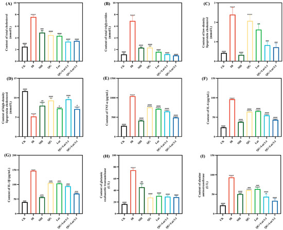 The effect of quercetagetin, lutein, and their combination on the content of (A) total cholesterol in serum, (B) triglycerides in serum, (C) low-density lipoprotein cholesterol in serum, (D) high-density lipoprotein cholesterol in serum, (E) tumor necrosis factor-α (TNF-α), (F) interleukin-6 (IL-6), (G) interleukin-1β (IL-1β), (H) glutamic oxaloacetic transaminase, and (I) alanine aminotransferase (n = 3). Compared to the control group, * p < 0.05, ** p < 0.01, *** p < 0.001 and **** p < 0.0001. Compared to the IR group, # p < 0.05, ## p < 0.01, ### p < 0.001, and #### p < 0.0001 (n = 3).